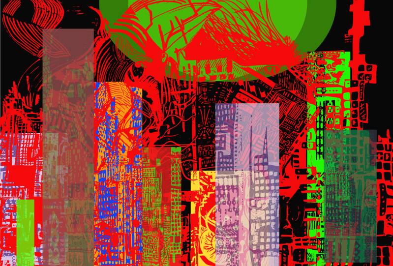 Each city in the project began with hand-drawn illustration onto A1 card. Other buildings were also made on separate paper, cut up and applied to the A1 sheet so as to build up layers of architectural complexity. Once imported into software, the drawings were then converted into vector images so that they could be coloured and scaled differently; some were made transparent to build up colours and lines/details to infer a fast-paced metropolis.